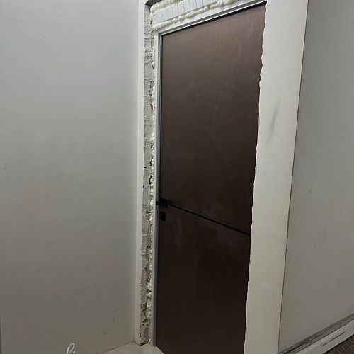 Дверь обратного открывания скрытого монтажа (толщиной 40 мм) поставляется с магнитным замком, алюминиевой кромкой по вертикальным торцам полотна, с 2-мя скрытыми петлями KUBICA для обратного открывания и специальным алюминиевым коробом.