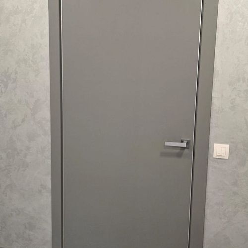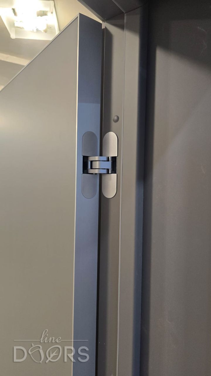 Дверь обратного открывания скрытого монтажа (толщиной 40 мм) поставляется с магнитным замком, алюминиевой кромкой по вертикальным торцам полотна, с 2-мя скрытыми петлями KUBICA для обратного открывания и специальным алюминиевым коробом.
