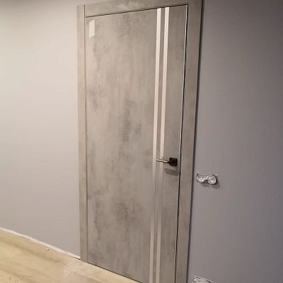 Стильная и современная межкомнатная дверь DG-506 (ДГ-506) Бетон светлый с декоративными молдингами серебряного цвета предназначена для установки в жилых и общественных помещениях, таких как квартира, частный дом или офис.