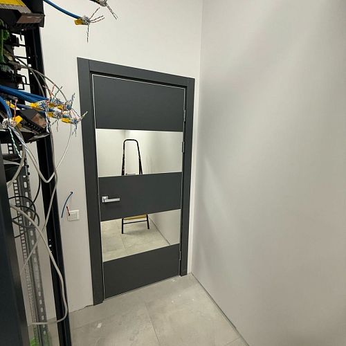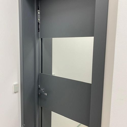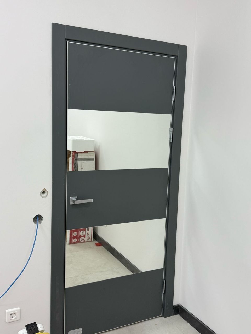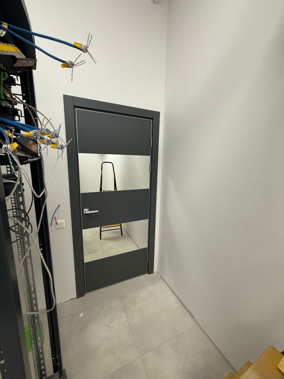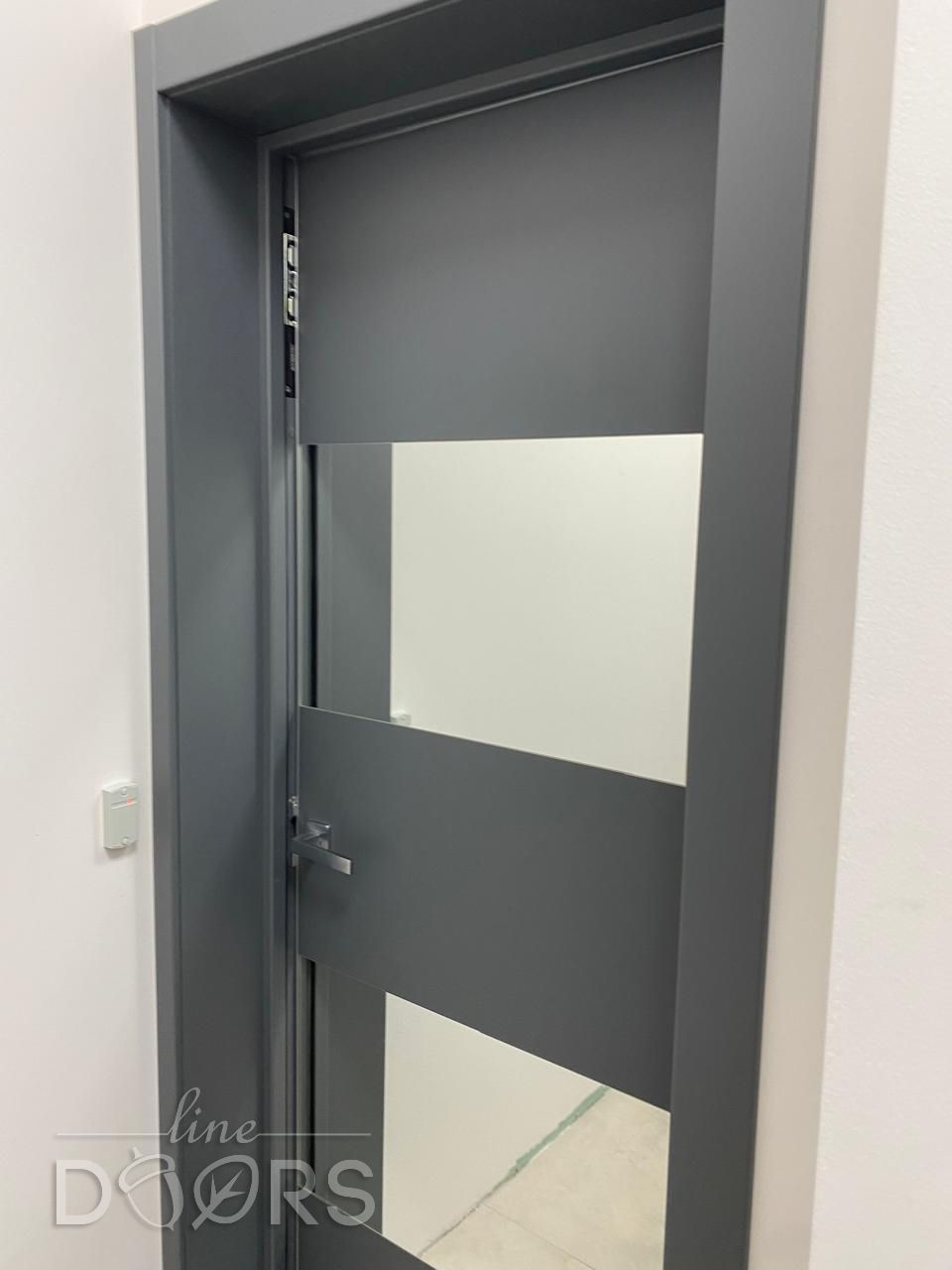 Дверь обратного открывания скрытого монтажа (толщиной 40 мм) поставляется с магнитным замком, алюминиевой кромкой по вертикальным торцам полотна, с 2-мя скрытыми петлями KUBICA для обратного открывания и специальным алюминиевым коробом.