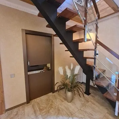 Дверь обратного открывания скрытого монтажа (толщиной 40 мм) поставляется с магнитным замком, алюминиевой кромкой по вертикальным торцам полотна, с 2-мя скрытыми петлями KUBICA для обратного открывания и специальным алюминиевым коробом.