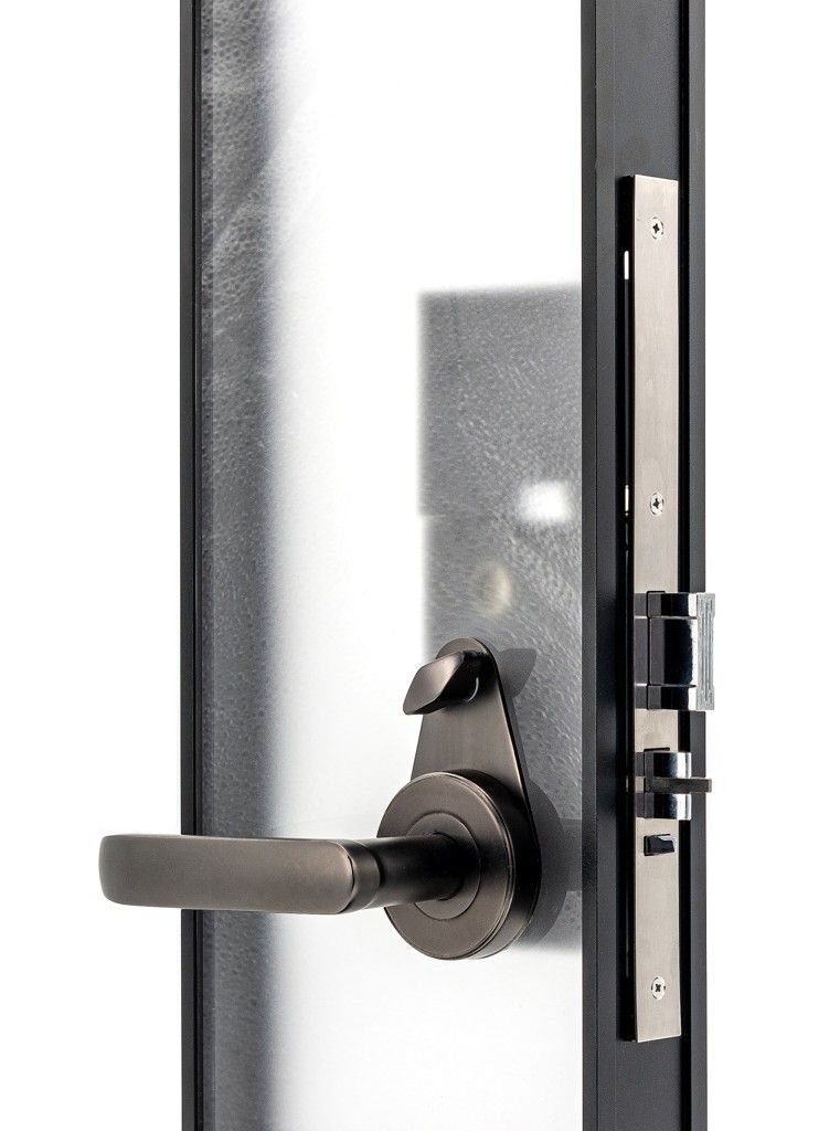 Накладка ручки с внутренней стороны двери может быть выполнена в двух вариантах. С ручкой-бабочкой защелки ригеля и без. В случае отсутствия ручки-бабочки достигается максимальный минимализм накладки, в этом случае защелка изнутри номера закрывается поднятием основной ручки вверх.