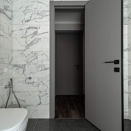 Дверь поставляется с алюминиевой кромкой с трех сторон (по вертикальным торцам полотна и сверху) и предустановленным магнитным замком под WC в базовой комплектации. Можно заказать комплектацию замка под ключ или под отельный замок. Возможна установка для открытия на правую и левую стороны.