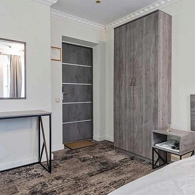 Стильная и современная межкомнатная шумоизоляционная дверь DG-605 (ДГ-605) Бетон темный с декоративными молдингами серебряного цвета предназначена для установки в отелях, гостиницах, офисах и других помещениях, где необходимо обеспечить хорошую звукоизоляцию. Подходит для установки в квартирах и частных домах.