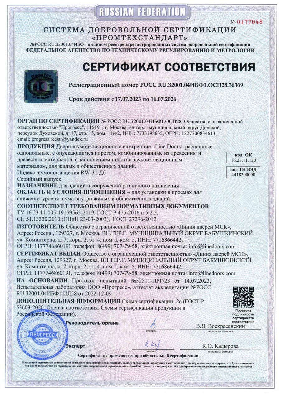 Шумоизоляционные двери изготавливаются с усиленным каркасом по периметру, а также с горизонтальными и вертикальными ребрами жесткости. Имеют специальный шумопоглощающий наполнитель и выпадающий порог. Индекс звукоизоляции воздушного шума Rw в зависимости от конструкции 31 дБ или 42 дБ.